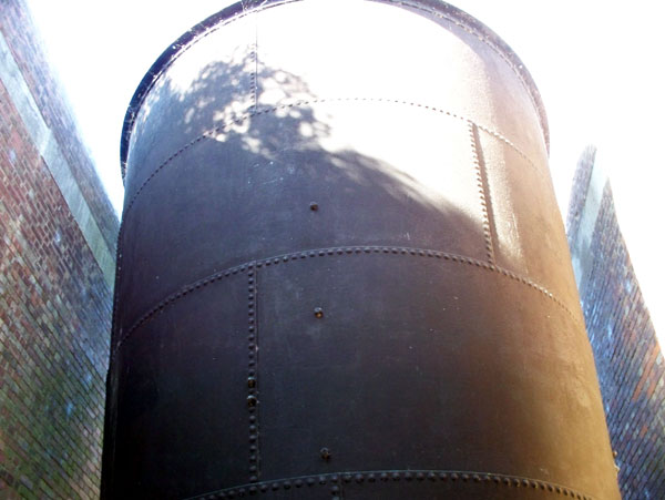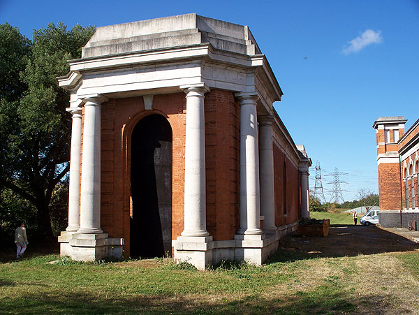 The pump hall is of brick with arched windows, and inside is lined with white glazed bricks. A travelling crane runs along the top of the walls below the metal framed roof. The Humphrey pumps are almost unique, as they worked by using gas explosions to oscillate water in a huge U-tube, part of which (the black funnels) can be seen in the adjoining building, which is decorated with classical pillars. The third building was formerly used for gas generation.