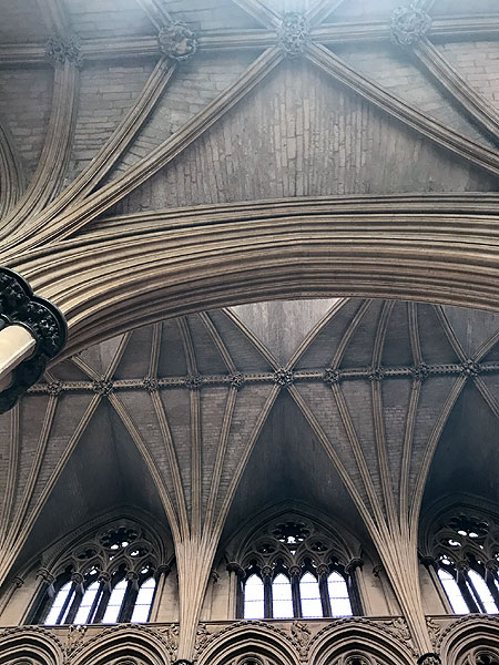 The fine lattice stonework on the tower can be seen from afar. Close up, the size of the building both inside and out is impressive. The East window, one of the biggest such windows in England, is vast. There is a complete cloister roofed with vaulted and densely carved stonework. The Lady Chapel is very large, and decorated with stained glass and carved stone.
