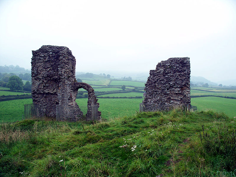 Today the castle is very ruined, with the now three-sided Great Keep, built for the FitzAlan family’s resifential use, being the most complete part. Adjacent platforms, the site of the outer baileys, have no structures above ground. The River Clun loops around the castle far below the mounds.