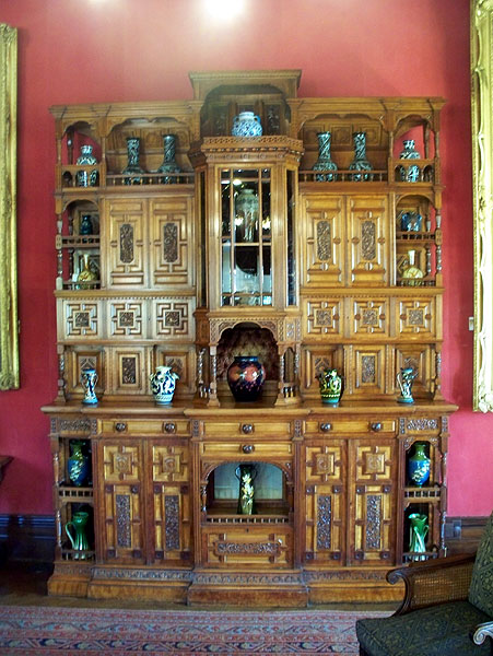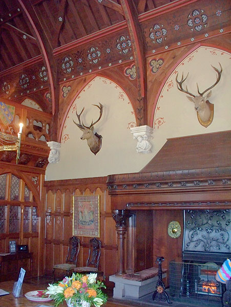 The hall, with medieval-style Gothic arches, gallery, timber vault, painted furniture and curious carvings, is the only room to be completed more or less as Burges intended. Recently a bedroom has been reworked using Burges’ original design drawings and given a patterned ceiling, bird wallpaper, and furnished with exotic original Victorian furniture made to his designs. Elsewhere are boldly painted, compartmental ceilings and elaborate chimneypieces. The overall impression is of bold designs and bright colours.