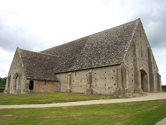 Great Coxwell Barn was built in the mid thirteenth century for the Cistercian abbey of Beaulieu. 152 feet long, it has buttressed walls of Cotswold stone, and a soaring stone-tiled roof with its rafters supported on slim oak timbers. Projecting porches either side of the barn house the original doors.