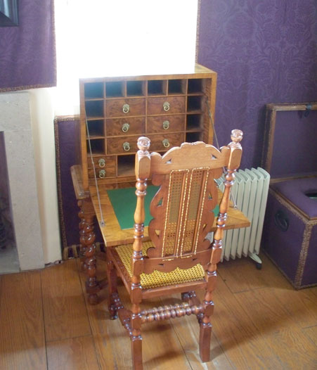 Upstairs are an Edwardian bathroom and a number of bedrooms. The main bedroom is L-shaped and has a barrel ceiling over the bed. The walls are stencilled and copies of Margaret Macdonald Mackintosh’s silk hangings hang over the bed. In the upstairs east wing rooms, traces of the original decorative schemes have been uncovered.