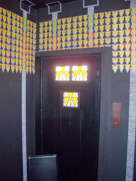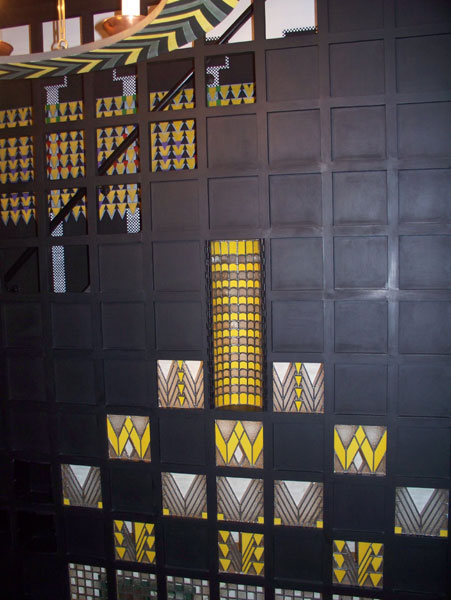 The house was jointly designed by Mackintosh and his client. Inside, the basement kitchen was very modern for its day. Upstairs at street level the dining room looks modestly modern, while the hall/lounge looks nearly as bizarre as the photo below suggests. Most surfaces are finished in black, with a coloured frieze applied to the walls, and black furniture. The staircase is turned through 90 deg from its original (and more conventional) position, and is divided off by a lattice screen, also painted black at this level.
