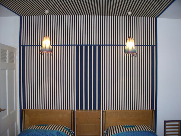 On the second floor are a study, repainted in the original colours, and the guest bedroom, which has a striking fabric backdrop to the twin beds which continues up the ceiling.