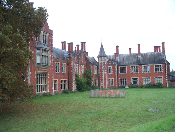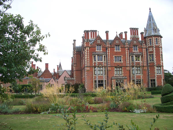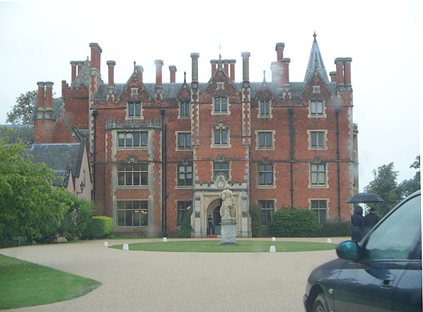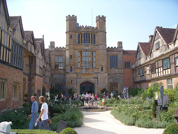 The house, as seen from the courtyard, has two projecting brick and timbered wings in a Tudor-ish style, connected by an imposing stone gatehouse. From the other, West, side, the stone gatehouse, flanked by a pair of Gothic styled wings, dominates.