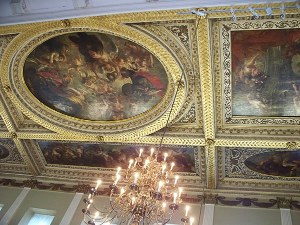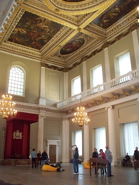 Banqueting House, Whitehall is one of the first English Palladian style buildings, designed by Inigo Jones for James I and finished in 1622. It was intended for masques, receptions and entertainments, but was less used after the ceiling paintings by Peter Paul Rubens were installed in 1630-4. The smoke from candles during evening receptions had begun to damage the paintings.