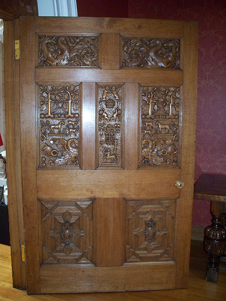 The focus of the interior is the three-storey Norman Hall, inserted by the Orkney heir, Thomas Hamilton in the 1830’s. The hall doors are beautifully decorated with carved wood panels.