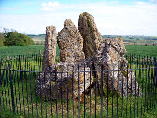 The Rollright Stones are three groups of prehistoric standing stones in rural Oxfordshire. Next to the lay-by is the King’s Men stone circle, around the edge of the field are the stones of the Whispering Knights burial chamber, and across the road from the lay-by is the single King’s Stone. All the stones look heavily eroded.