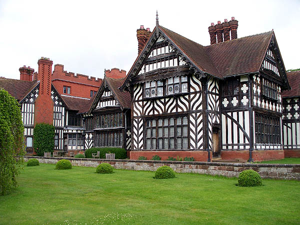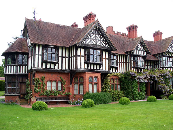Wightwick Manor is one of the finest surviving examples of a house furnished under the influence of the Victorian Arts and Crafts Movement. Thought built in the late nineteenth century, it is designed to look like a late medieval house, with its external black-and-white timbering and small-paned leaded windows. The eastern half, which was built later, is the more richly decorated, with stripes, swirls and quatrefoils, said to be in the style of Tudor buildings of the Welsh Marches.