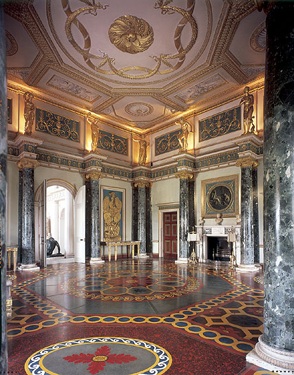 Despite its expansive setting, the house, vaguely reminiscent of a toy-box white fort with ornamental crenellations on top, is not particularly attractive. Inside, however, it’s a different matter. The main entrance opens into Adam’s impressive Roman-inspired hall, all monochrome stucco with black and white checkered flooring. Next is the Ante-room, still Roman but a riot of colour, with a famous scagliola floor, black marble columns, gilded statues and elaborate ceiling. An inconspicuous doorway in the outer corner leads down to viewable rooms in the basement. Next is the State Dining Room, all white and gold, with statuary, bare of any textiles that might retain the smell of food. The Red Drawing Room, besides scarlet silk-hung walls, has a remarkable coved ceiling painted with 239 medallions, and portraits of the Stuart royal family. In the 136ft. Long Gallery, there is elaborate pale plasterwork on the walls and ceiling. When I saw it, the room retained ancient grime but some sampled areas had been cleaned. One visits more fine rooms with more recent interiors, before reaching the main staircase where one can ascend to visit some interesting bedrooms (around to the left at the top of the stairs) passing a collection of portraits IIRC. Before leaving the house one can enter the attractive central courtyard around which one has just walked. In the basement are structural relics of the religious building of conjectural size which once stood on the site.
