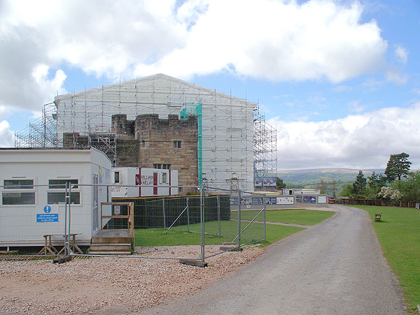 Revisited April 2017. Restoration continuing – first half completed and scaffolding moved to second section. Went up scaffolding for roof visit and view of light wells over kitchen.
