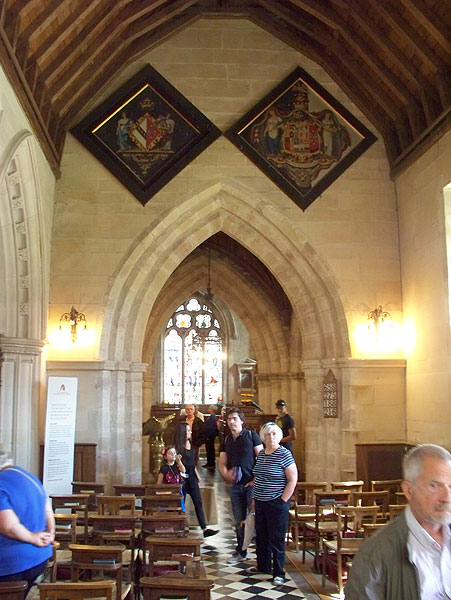 Some wings are two storey, and others (with lower ceilings) three storey, and the interiors are styled after different periods from Tudor to Georgian. There is an interior courtyard. One of the rooms contains panelling from a Jacobean house that originally stood on the site.