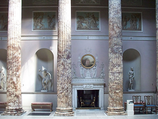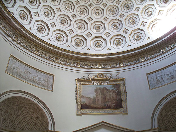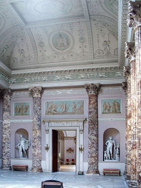 The lower hall is a forest of columns supporting the heavy floor and columns above. The State floor of the central block has an series of rooms on two rows (front and back). The centre front houses the double-height Marble Hall with Roman theme decor. At centre back is a round hall, Pantheon like with an oculus, and black iron stoves to warm the room a bit. There are lots of paintings in various rooms by minor artists.
